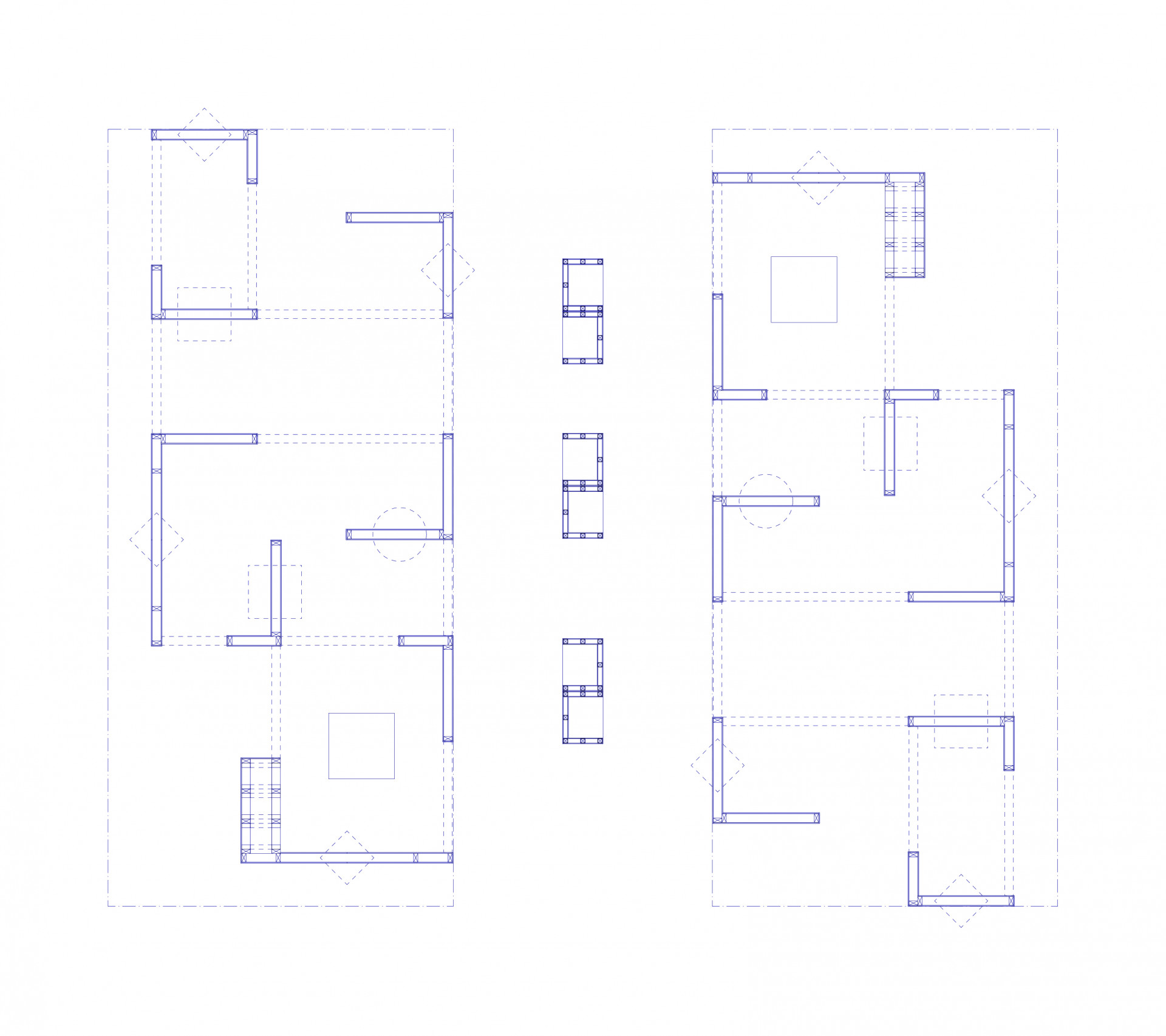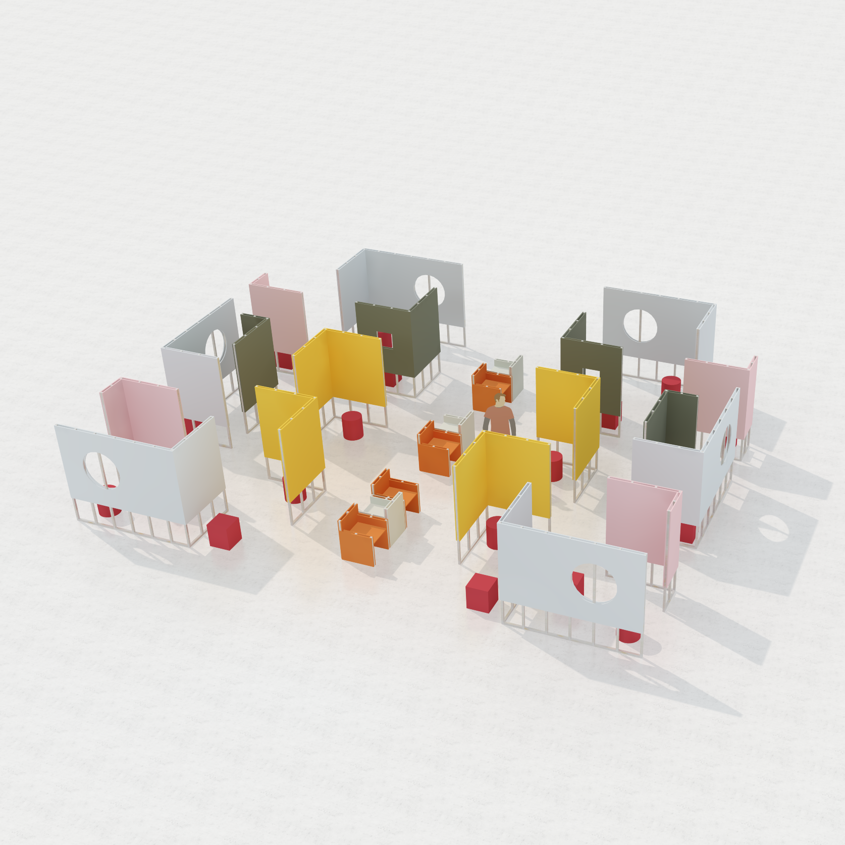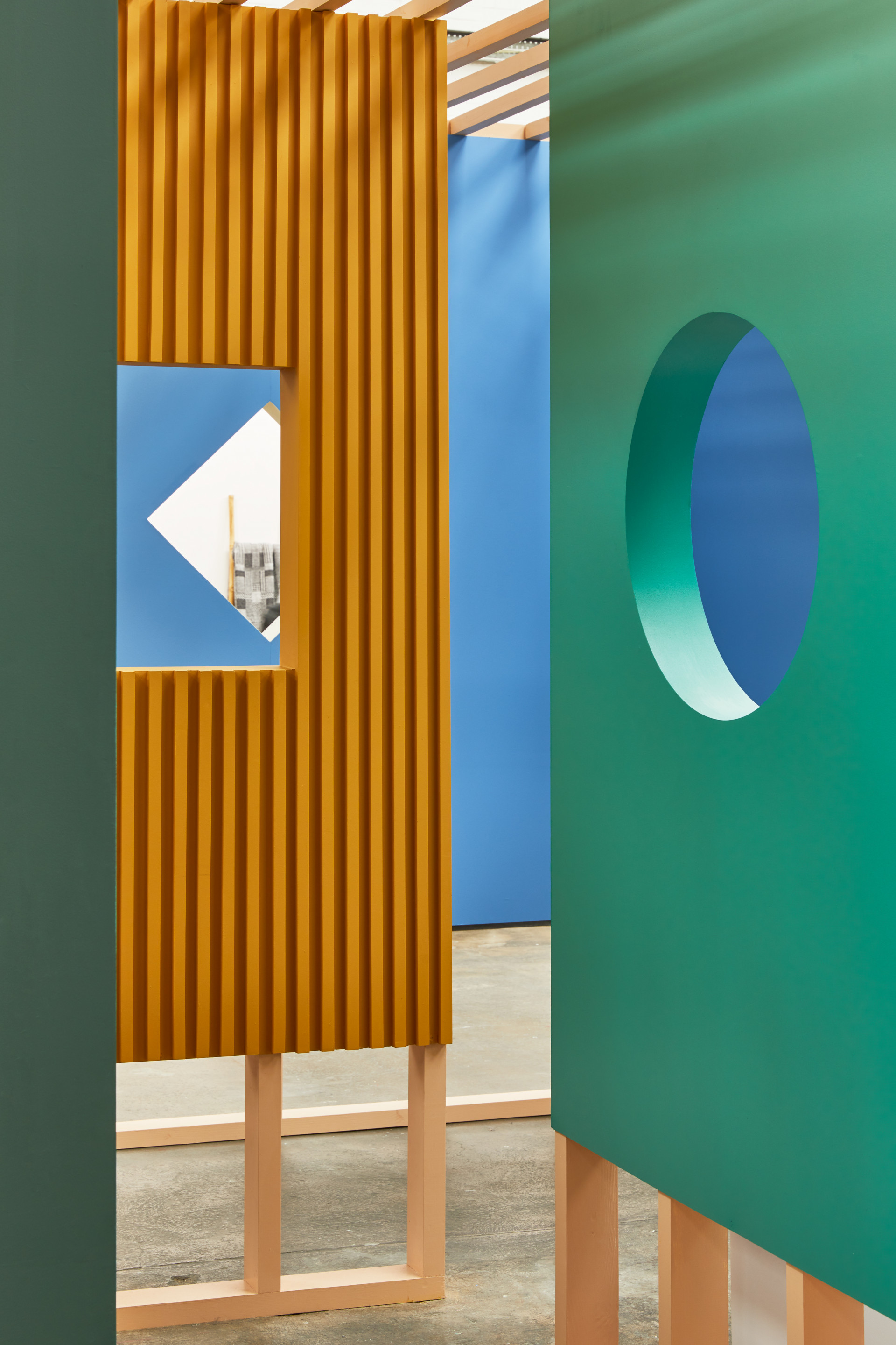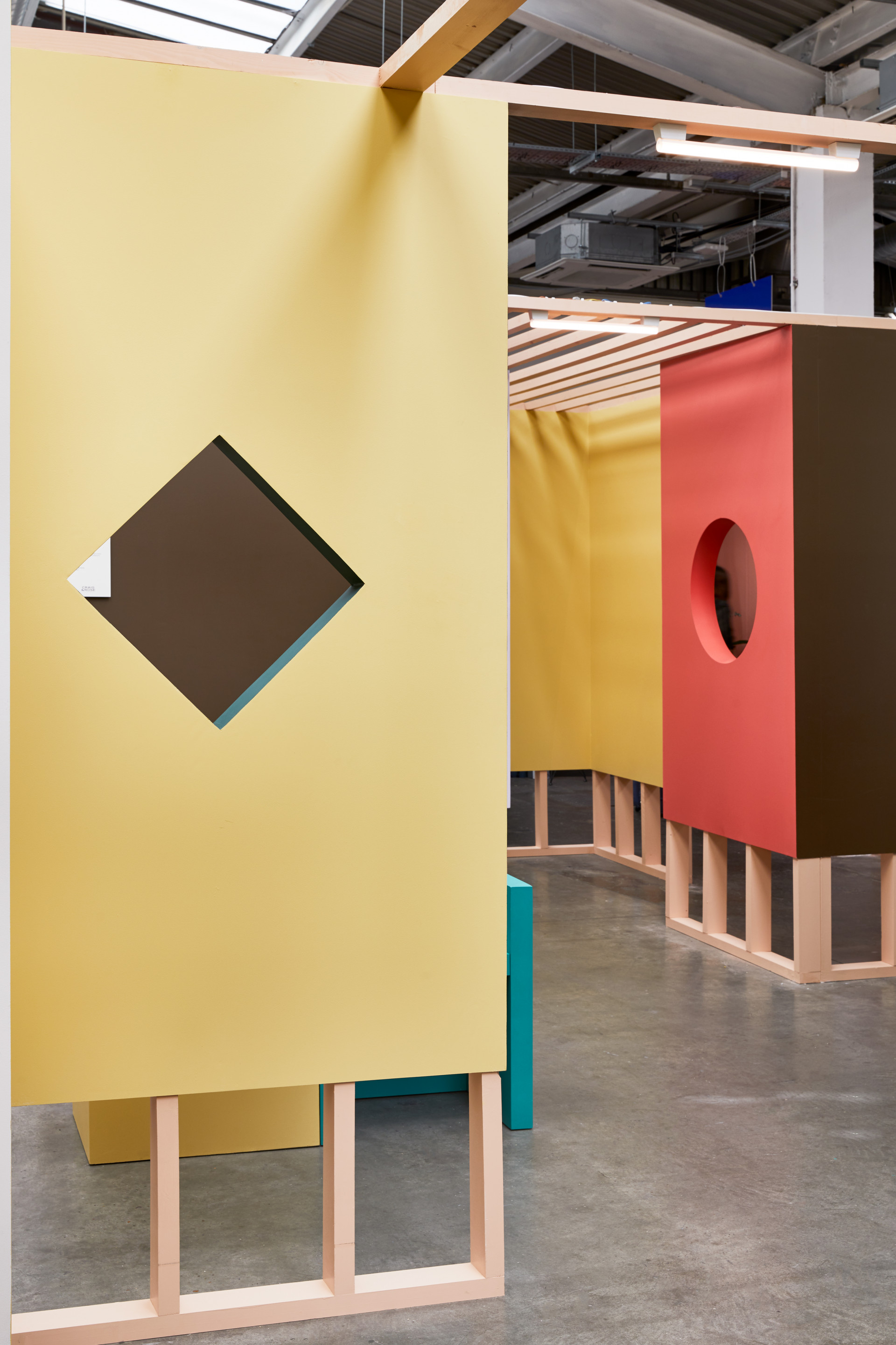 Our idea was to create a series of fragmented rooms defined only be their corners. These L shaped timber walls would be arranged to create a variety of spaces and routes through the installation. The Bauhaus is synonymous with the square, triangle and circle shapes and so these iconographic openings were strategically placed to created surprising views of specific colour combinations.